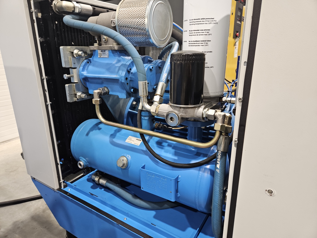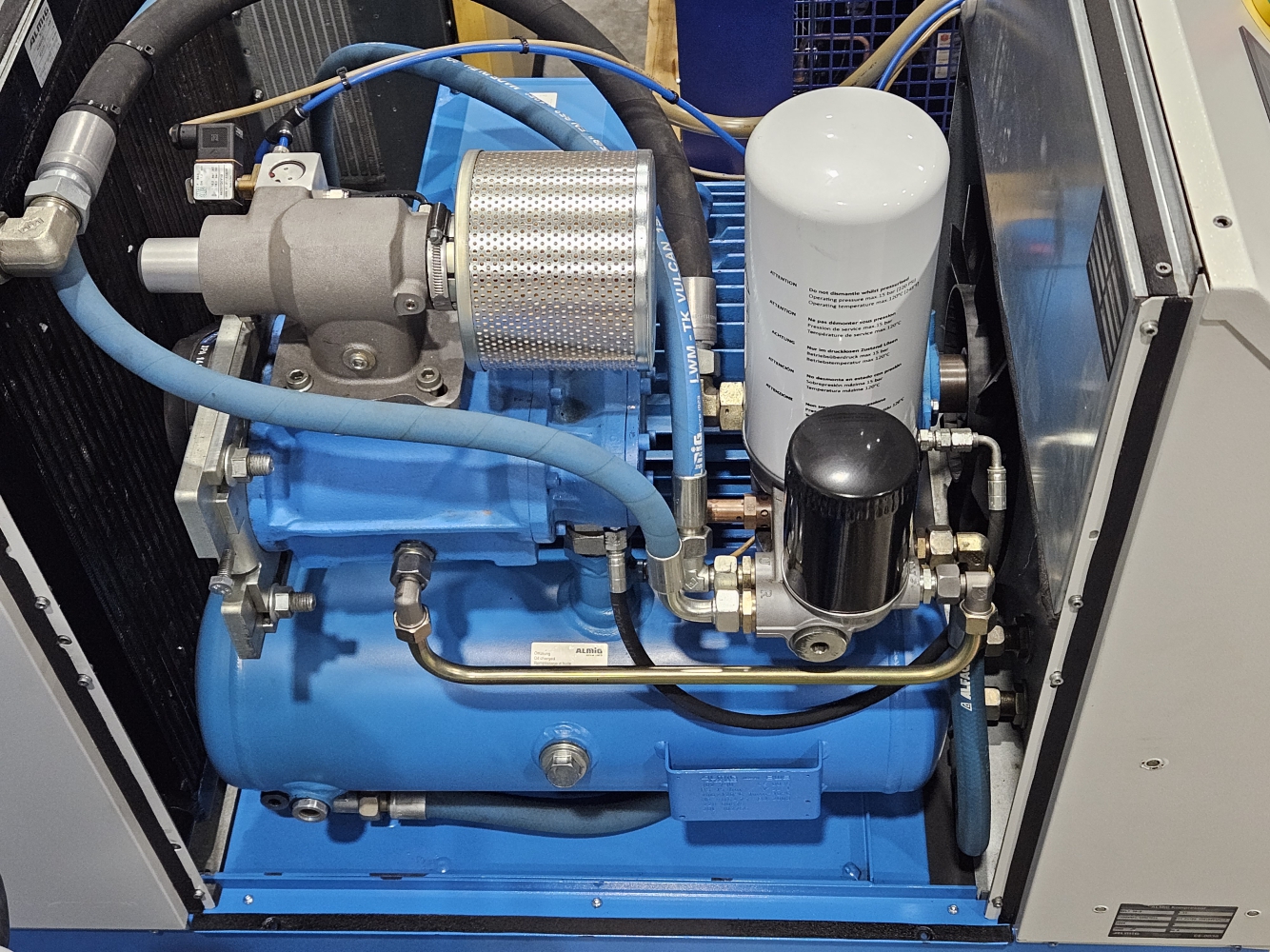 - Kompressorisse on tehase poolt lisaks sisseehitatud ka soojusvaheti ning võimalik soovi korral kompressori toodetav soojus kanda üle tarbe või kütte veeks.